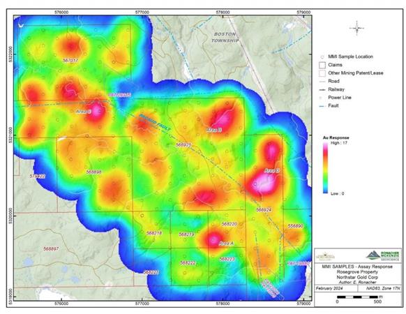 Several critical minerals anomalies were also identified by the Rosegrove MMI survey, which strongly suggests that volcanogenic exhalite horizons with possible polymetallic volcanogenic massive sulphide (VMS) lenses are present in the south portion of the Rosegrove survey grid. Two distinct copper trends and zinc anomalies (up to 122 times background) possibly represent a 3 km northwest strike extension of the Boston Creek (Cam) VMS Copper Trend, defined to the southeast on the nearby Miller Copper-Gold Property.