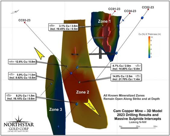 Northstar completed a four-hole, shallow diamond drill program at Cam Copper Mine in late 2023, confirming a VMS nature to high-grade copper mineralization with each hole intersecting multiple massive chalcopyrite, high-grade copper horizons grading up to 14.8 per cent copper over 2.5 metres.