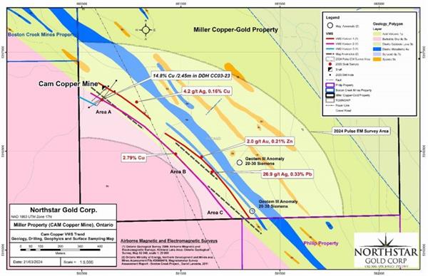 Northstar is currently awaiting results from the recently completed borehole electromagnetic (BHEM) and surface electromagnetic (EM) surveys. Northstar will follow up 2023 Cam Copper trend surface sample and 2024 EM survey results and targets in the spring of 2024, with prospecting, geological mapping, sampling and a Phase II diamond drill program.