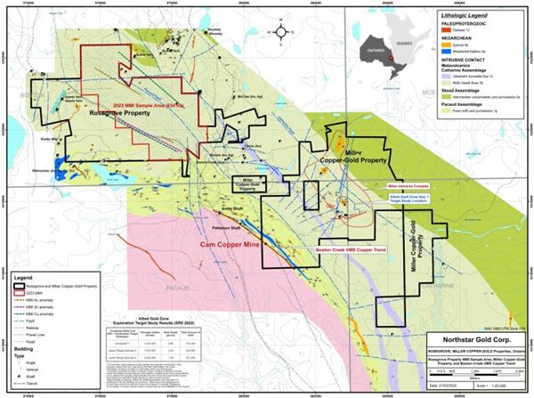 Northstar’s Miller Copper-Gold Property hosts the near-surface Allied Gold Zone deposit (upper SRK (Canada) Exploration Target range > 500,000 ounces of gold averaging 2.04 g/t), open to expansion (Figure 1). Northstar Gold’s exploration efforts at Miller extend beyond gold, as demonstrated by its more recent copper focus on the Miller Copper-Gold Property. Located 18 km southeast of Kirkland Lake, Ontario, this property also encompasses the historic Cam Copper Mine, a road-accessible shaft mine with a rich history as a small-scale producer of high-grade ‘direct shipping’ copper ore.